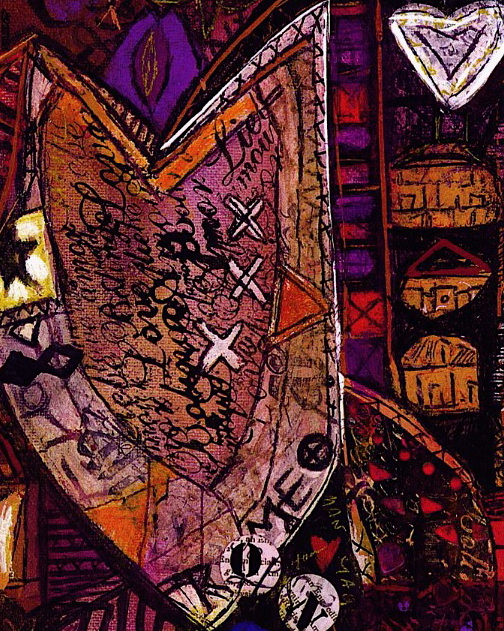 Medium: Acrylic, permanent ink, collage, on canvas with archival varnish