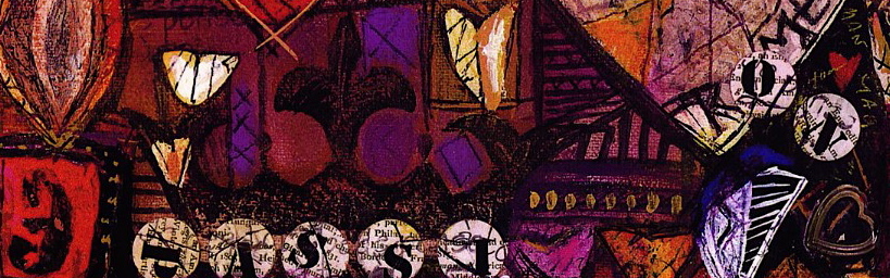 Medium: Acrylic, permanent ink, collage, on canvas with archival varnish