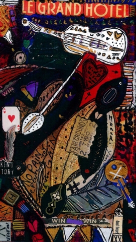 Medium: Acrylic, permanent ink, collage, on canvas with archival varnish.