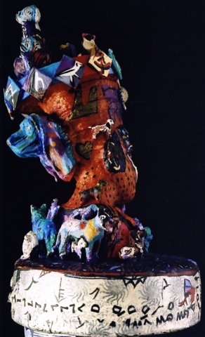 Medium: acrylic on/with objects, wood, rubber, plastic, metal (mosaics) and archival varnish. The bust of Nefertiti is of resin plastic and other compounds. This painted sculpture (3-dimensional assemblage) can be showcased on a sculpture stand, podium, shelf, or inside a glass case.