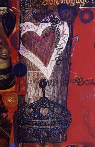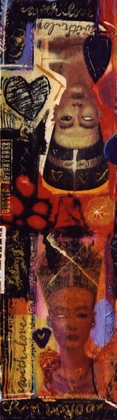 Medium: acrylic and permanent ink on canvas/wood with collage elements (photographic transfer on canvas) and archival varnish. This mixed media Collage painting hangs on a WALL .
