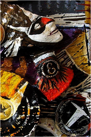 Medium: acrylic on/with objects, wood, rubber, plastic, metal and archival varnish. The head of Nefertiti is of resin plastic and other compounds. This sculptural painting (2-dimensional assemblage) can hang on a WALL, decorative support, graphic frame, or in a shadow box.
