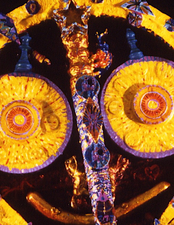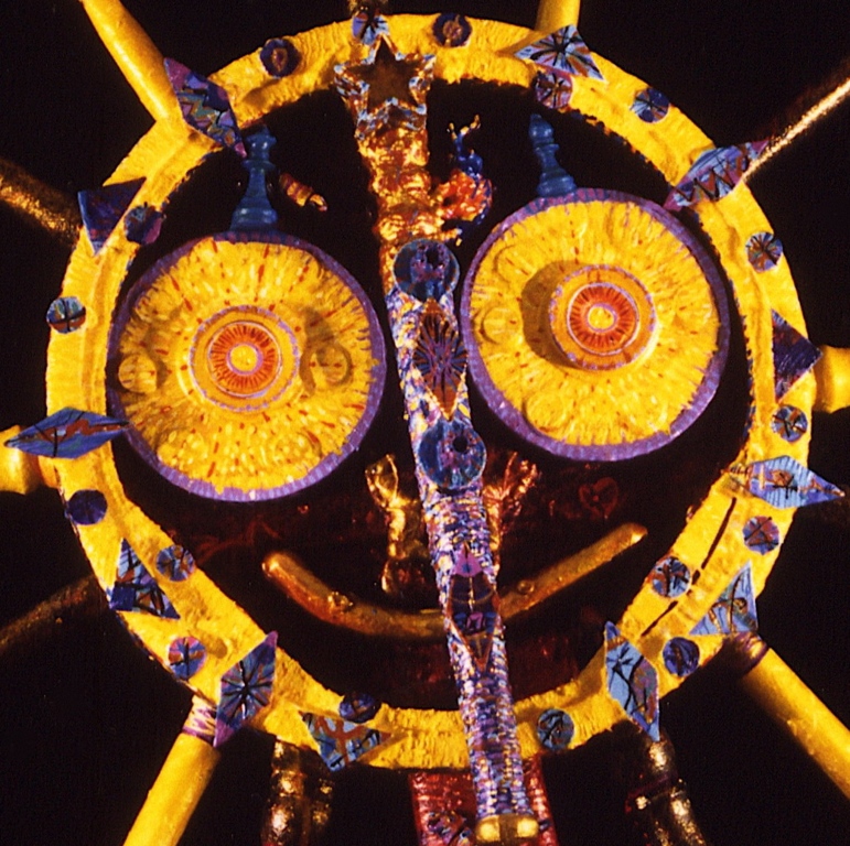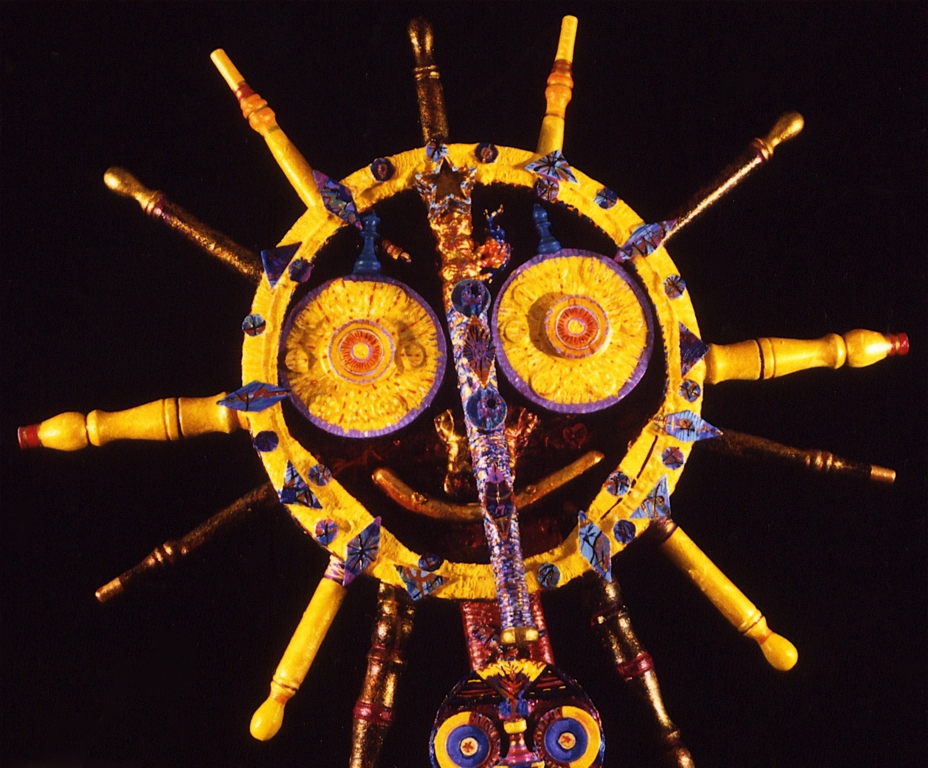 Medium: acrylic on/with objects, wood, rubber, plastic, metal and archival varnish. (The decorated painted table is part of this sculpture). This painted sculpture (3-dimensional assemblage) can be showcased on a sculpture stand, podium, shelf, or inside a glass case.