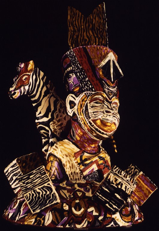 Medium: acrylic on/with objects, wood, rubber, plastic, metal and archival varnish. The bust of Nefertiti is of resin plastic and other compounds. This painted sculpture (3-dimensional assemblage) can be showcased on a sculpture stand, podium, shelf, or inside a glass case.